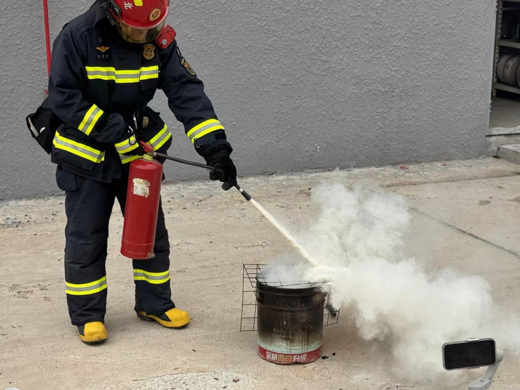 在充电宝撞击实验中,刘丙涛穿上灭火战斗服,做好自身防护,将一块电池容量为20000毫安锂聚合物电芯的充电宝,放置在一块空旷硬化地面上,准备利用消防斧,模拟现实生活中外力挤压、穿刺等冲击对充电宝的影响。