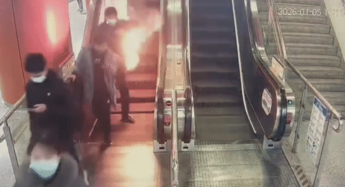 从上海地铁的监控画面可见,该乘客从站厅层乘手扶梯下行至站台层时,其外套一侧已冒出明火。站台候车乘客察觉后,迅速向一侧躲避。现场工作人员发现后,立即组织应急处置,使用灭火器迅速将火扑灭,未影响地铁正常运营秩序。