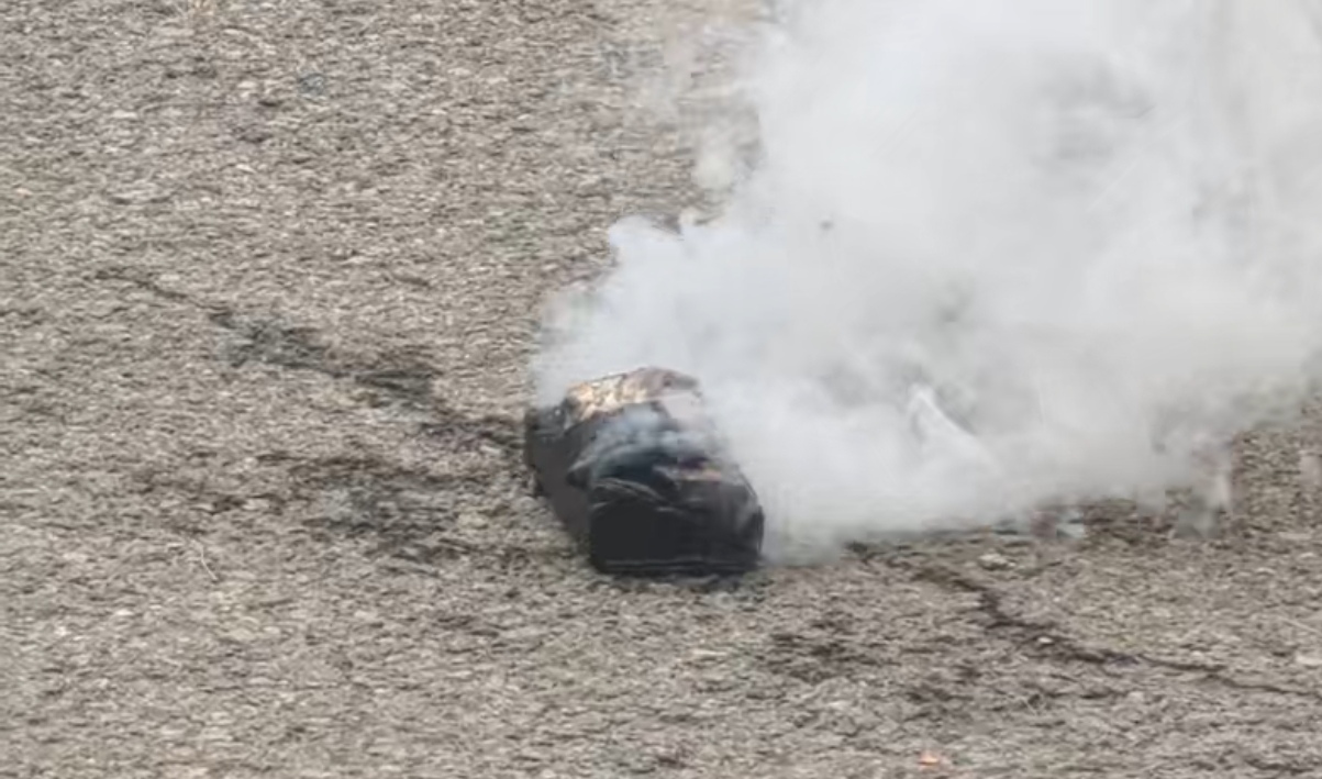 刘丙涛先用日常生活常见的干粉灭火器喷向正在燃烧的充电宝,明火迅速被熄灭,黑烟也迅速减少。但不过10秒钟,充电宝内部又开始冒烟。“干粉灭火器虽然能一时控制住燃烧,但无法阻止电池内部能量的释放,刚用测温枪测了一下,充电宝的表面温度仍超过190℃,代表其内部仍有热反应。”刘丙涛解释说,更有效的灭火方法是用水浸泡充电宝,灭火的同时给充电宝持续降温。